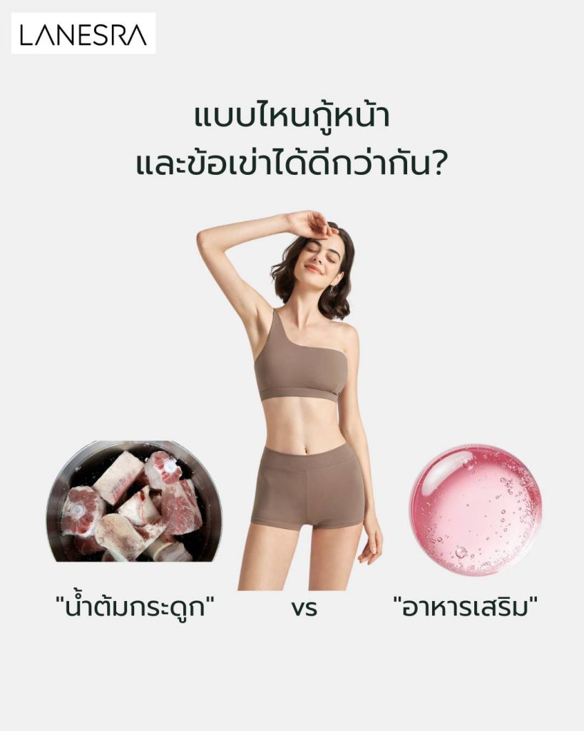 ยกที่ 2: เรื่องข้อต่อ (Joints) ผู้ชนะ: อาหารเสริม คอลลาเจนผงผ่านกระบวนการ Hydrolysis ทำให้โมเลกุลเล็ก ดูดซึมไปซ่อมแซมกระดูกอ่อนได้ไว น้ำต้มกระดูกมี Glucosamine ธรรมชาติก็จริง แต่ปริมาณน้อยและคาดหวังผลลัพธ์ยาก